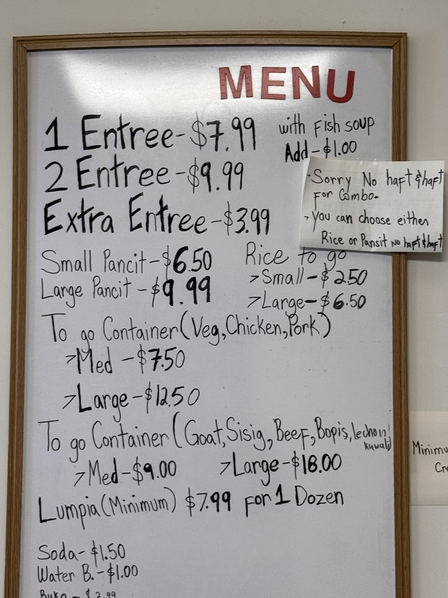 “ The food itself was delicious and reminded me of my Lola’s cooking, but I wish they had more selections. There were only a few choices on a Saturday afternoon. The service was great and the worker was super friendly. Like others have mentioned, the portions are HUGE! There’s plenty of pancit in a 2 item combo to split with someone if you only want 1 entree each. And for $9.99?! It’s a great deal! ”
